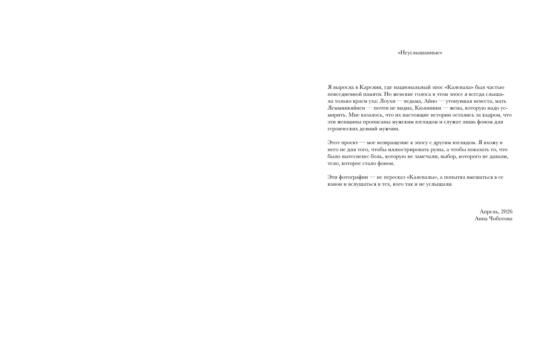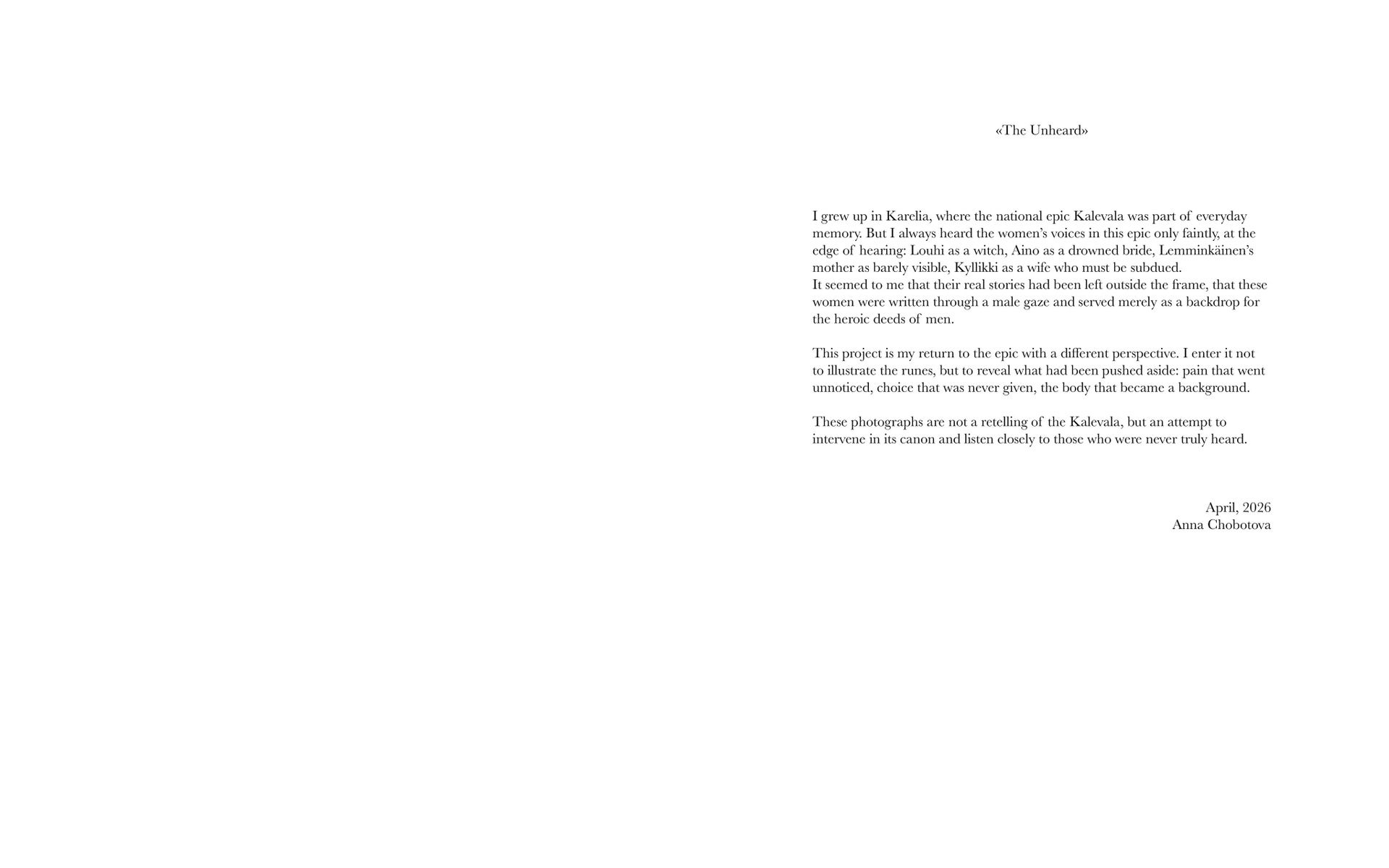 I grew up in Karelia, where the Kalevala epic was part of everyday memory. But women’s voices were always muffled—on the periphery of the narrative, like a backdrop to men’s exploits. Their pain, loss, and lack of choice were inscribed in the canon, but unheard.